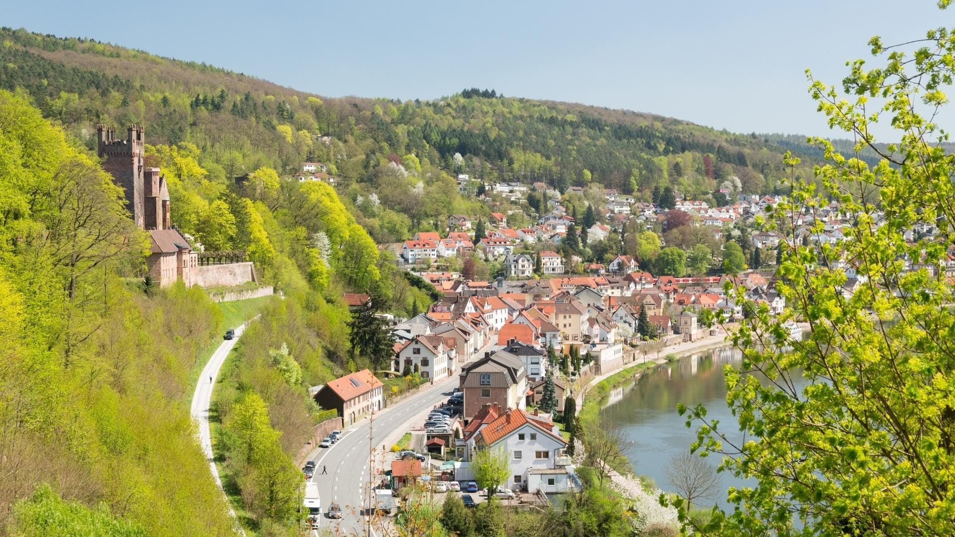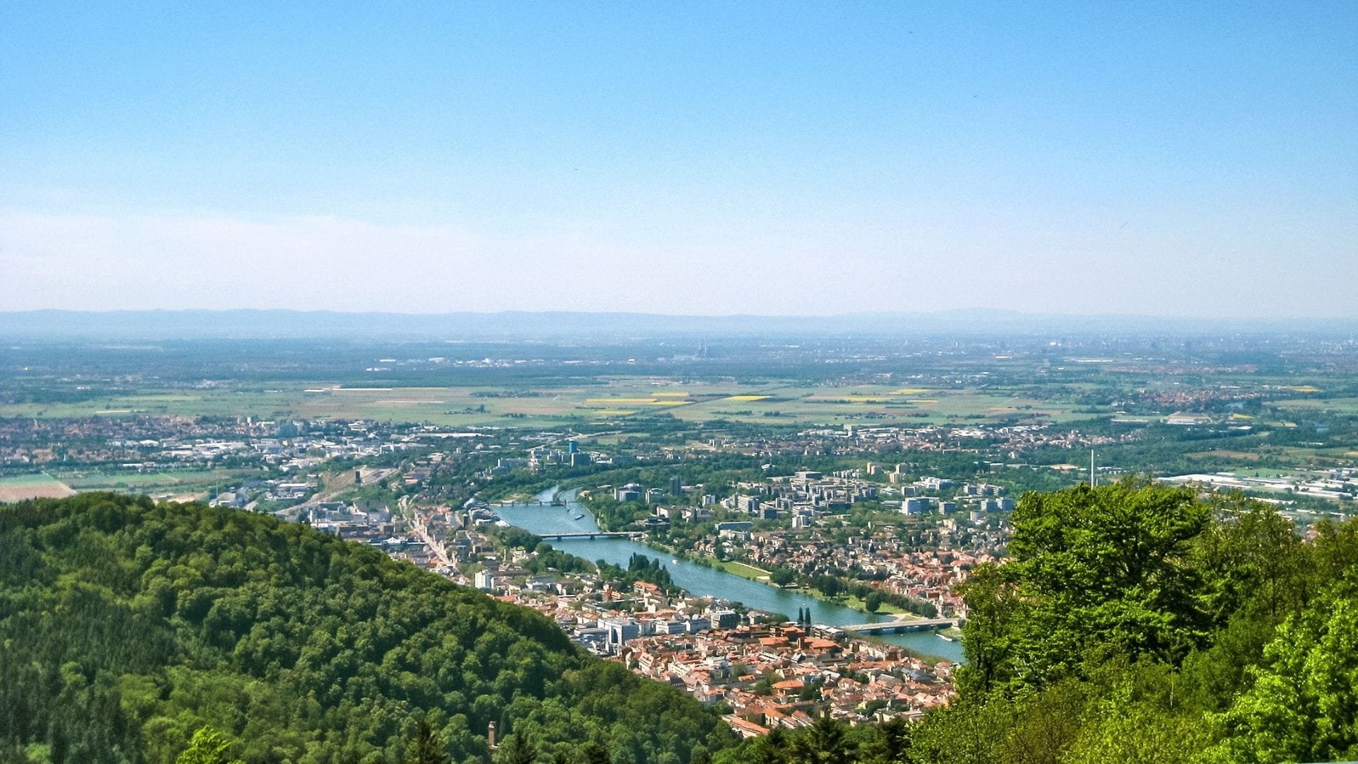 Das Neckartal gibt der Stadt ihre Landschaftskulisse: Der Fluss durchbricht den Odenwald, gräbt sich tief in den Buntsandstein und zieht Schleifen durch das Tal. Direkt aus dem Flussbett steigen steile Hänge auf, teils über 400 Meter über der Talsohle. Wenn du hinschaust, erkennst du den warmen roten Ton der Felswände – auch an Schloss und Alter Brücke.